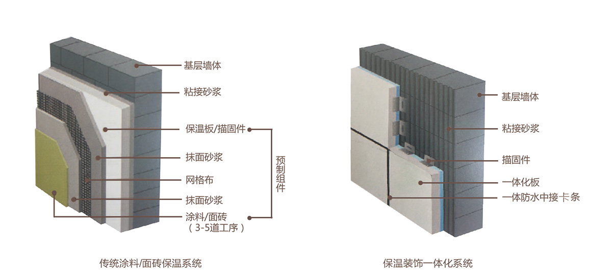 传统面砖保温系统和保温装饰一体化系统制作方法对比